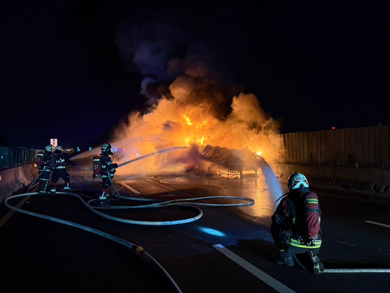 【記者莊曜聰/雲林報導】國道1號南下248.4公里雲林大林段今天清晨發生火燒車事件,滿載化學物質的聯結車疑似油箱破裂起火,火勢相當猛烈,警消到場時已經陷入火海,司機及時脫困,火勢在6時撲滅,但這起事故仍在排除中,現場僅開放內線通行,造成後方車流回堵嚴重,現在仍在塞車,用路人可提前改道。