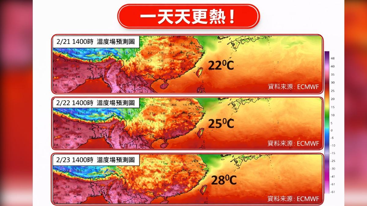 氣象專家指出,今日天氣持續回溫,預估接下來幾天氣溫一天比一天還要來的熱,今明西部高溫上看26至30度或以上,不過日夜溫差也變大,甚至會相差15度以上,提醒早晚還是要適時調整衣物穿著。至於下週二後將有連續幾波短波通過,天氣型態將變為晴雨多變、春季易降雨,且下下週日至下下週一影響會更加擴大、雨勢亦較強。台灣大學大氣科學博士林得恩在臉書「林老師氣象站」發文指出,今明2日環境受偏東風至東南風影響,西半部下沉增溫,天氣穩定,高溫晴朗,氣溫一天比一天還要來的熱。東半部地區高溫可達25至28度,西半部地區白天高溫更在26至30度或以上,澎湖地區24至27度,就連金門及馬祖地區最高溫也分別在22至25及16至19度之間。