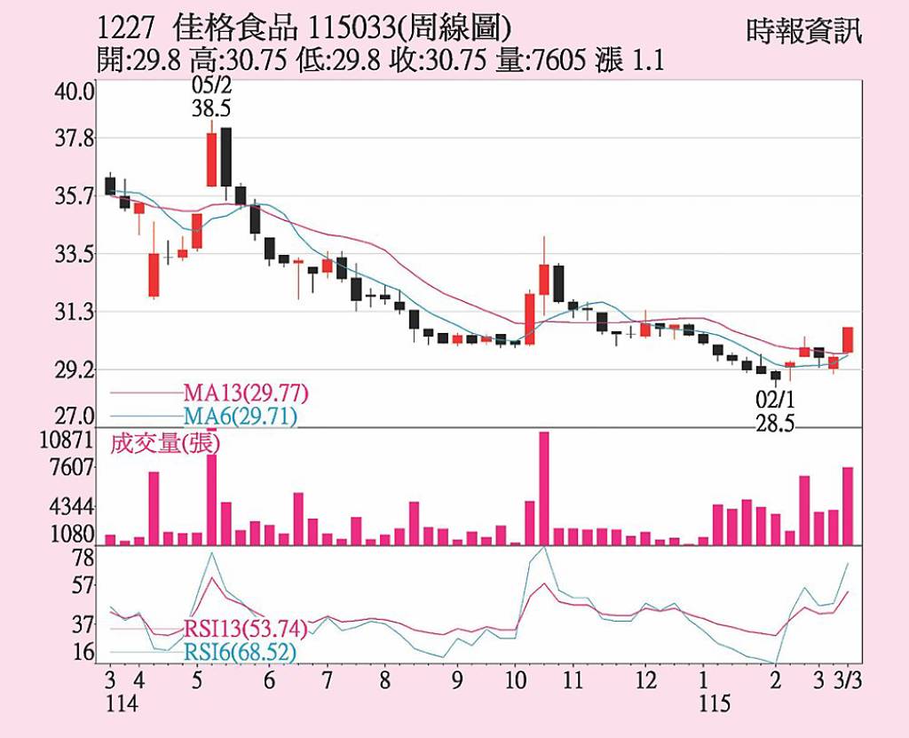 佳格(1227)受惠前二月合併營收年增雙位數成長,加上因中東戰火穀物期貨漲拉抬行情,外資轉買615張,帶動行情往上,20日收盤拉漲2.5%、30.75元作收,站上月、季、半年線之上。 去年合併營收278.72億元、稅後純益12.09億元,每股稅後純益(EPS)1.33元,均呈現年減,今年首季可望在農...