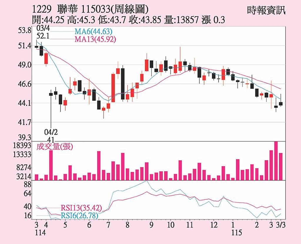 聯華(1229)受惠於去年營收獲利創高,近期股價盤整向下格局,或有機會在聯華氣體於中東戰事波及而行情往上,20日持續下跌收盤來到43.85元,外資賣超633張,持續在月、季、年線以下。 聯華橫跨麵粉事業、電子產品服務事業、投資事業、租賃事業,以及轉投資氣體事業,聯華投控在去年合併營收135.84億元...