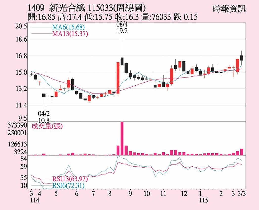 新纖(1409)因中東戰爭影響推升產品上漲,吸引法人及短多買盤同步加碼,近期股價呈震盪走高格局。20日股價以16.3元作收,已創六個多月以來新高。短期周線、季線趨勢維持上揚。9日KD值趨線仍處交叉走升。量能呈「價跌量縮、上攻有量」格局。短期在美伊戰爭激勵原物料價格上漲下,股價可望在五日均線上下震盪整...