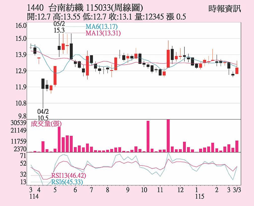 南紡(1440)因美伊戰爭帶動原物料價格上漲,部分紡品價格揚升,有利營運改善。上周股價在季線之上震盪走高。20日收盤13.1元,已站穩所有短均線之上。短期周線、月線趨勢也在上周反轉上揚。9日KD值高檔交叉走高。量能逐步加溫,各短線技術指標有利多頭。但14元之上浮額籌碼仍多,股價若要續攻,仍需量能持續...