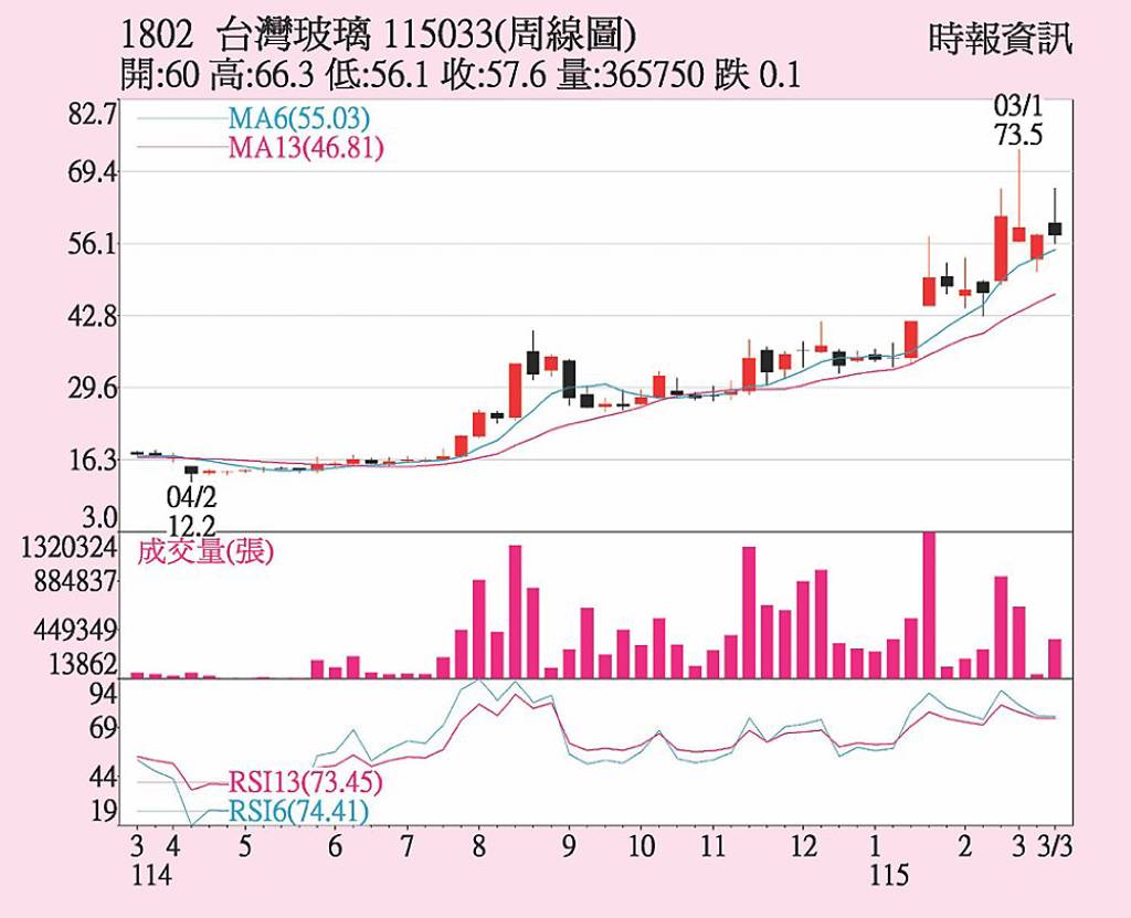 台玻(1802)電子級玻纖布題材仍是市場關注焦點。受市場供給可望增加消息面影響下,上周股價震盪加大,短多及當沖買盤主導盤面,20日收盤57.6元,短期周線、月線趨勢有下滑跡象。9日KD值將呈下彎交叉走跌,短線上技術指標恐不利多頭。不過,下跌時量能並未大量釋出,市場預期,短期股價可望測試短期55元是否...