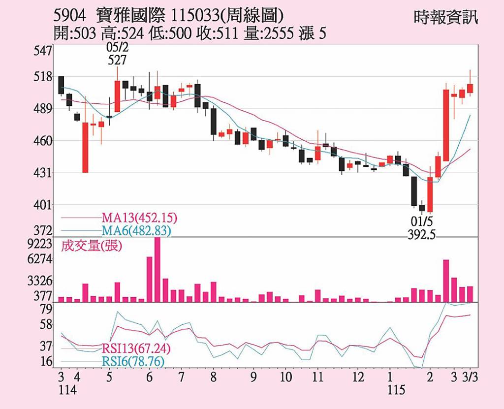寶雅(5904)受惠去年營收獲利雙創新高,加上股票「一拆十」規劃,不到一個月股價即站上500元大關,20日收盤來到511元微跌,籌碼面受到外資、投信等買進氣勢仍強,整體呈現暫時盤整格局,站穩月、季、年線之上。 去年在拓點、自有商品擴大與線上電商挹注下,合併營收253.19億元,稅後純益衝上31.44...