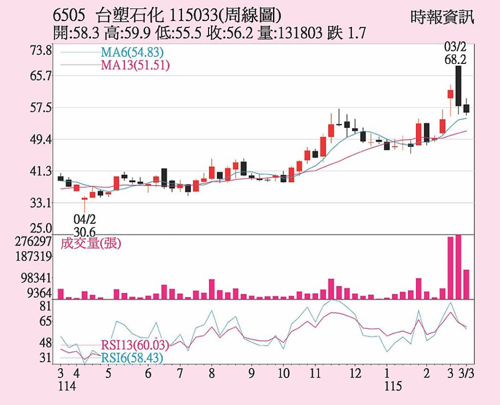 台塑化(6505)因美伊衝突未歇,油價延續每桶破百美元高價,乙烯飆漲310美元,助力煉油、石化事業表現,20日股價受獲利了結賣壓,中止連二攀揚走勢,以56.2元收盤,跌幅2.09%,成交張數21,908張。外資賣超1,546張,投信、自營商調節533張、378張。短線多空量能由強轉弱。 美伊衝突催化...