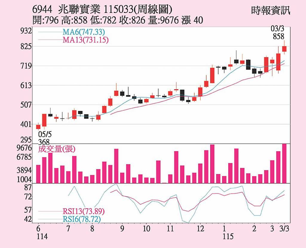 兆聯(6944)在手訂單創高,今年基本面持續看好。外資及法人買單逢低承接。上周股價沿短期五日均線之上緩步走堅。20日盤中一度創下歷史新高858元。雖在短期獲利回吐賣壓下收盤達826元,但仍站穩所有短均線之上,周線、月線及季線趨勢維持上揚。量能穩定,各技術指標有利多頭。 在手訂單餘額已衝破200億元大...