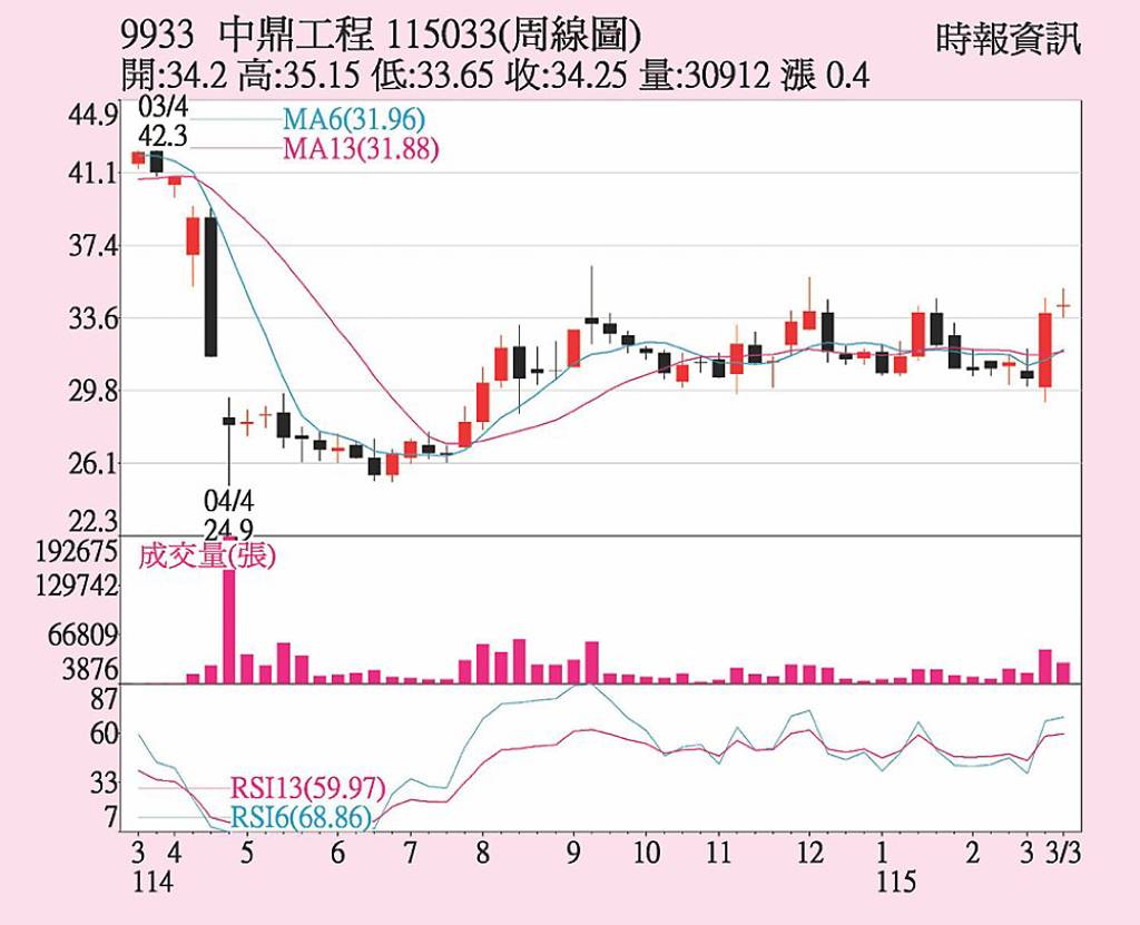 中鼎(9933)2025年手中在建工程案量及新簽約工程金額雙破歷史新高,帶動外資、法人及中長期買盤重回逢低布局,上周股價呈緩步走高格局。20日收盤34.25元,已站上月線、季線。短期周線也反轉上揚。量能增溫、9日KD值持續保持高檔交叉走高。股價走勢仍呈多方格局。市場預期,前波高點35元之上套牢籌碼浮...