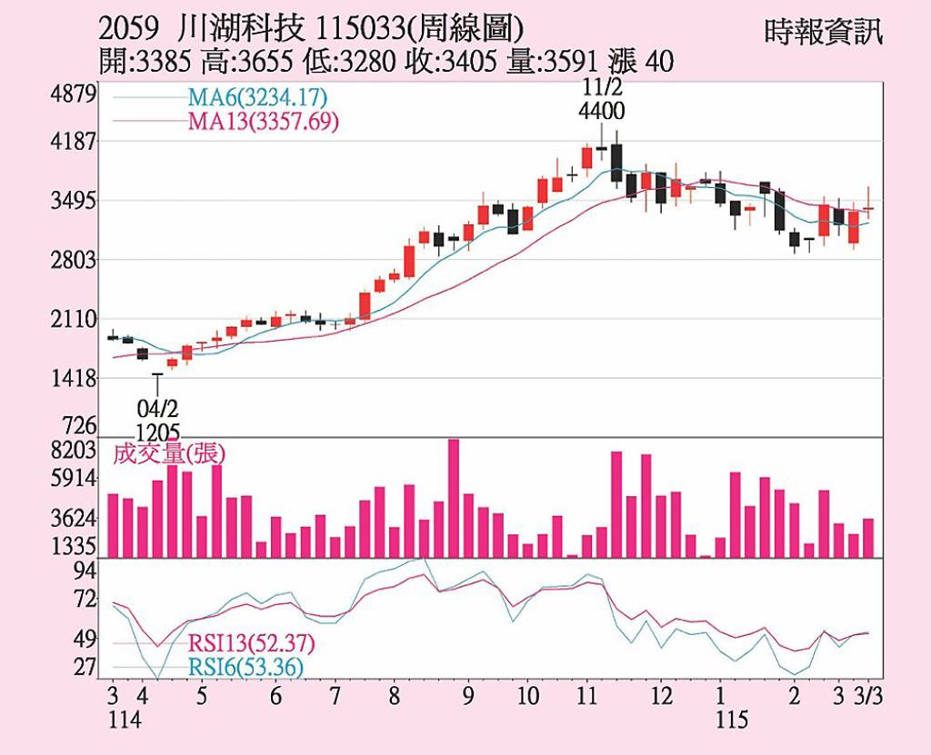 川湖(2059)20日受外資法人賣超衝擊,股價下跌170元,終場下跌將近5%,以每股3,405元收市,暫時失守5日均線,惟看好川湖在GPU及ASIC伺服器仍居主導地位之下,投信法人銀彈力挺,已連續7個交易日買超川湖。 川湖2025年繳亮麗財報成績單,全年每股稅後純益達103.23元,董事會通過配息5...
