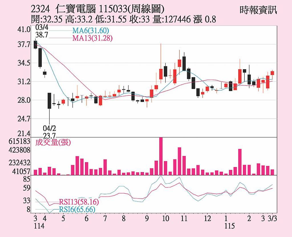 仁寶(2324)上周股價維持區間震盪格局,在前波反彈後進入整理,整體呈現高檔震盪整理格局,成交量同步縮減,顯示市場觀望氣氛轉濃、追價力道趨於保守,而籌碼呈現土洋對立格局,外資單周調節張數比較多,而投信與官股券商則站在買方。 仁寶先前在法說會上表示,預估2026年伺服器營收比重將突破10%,而AI伺服...