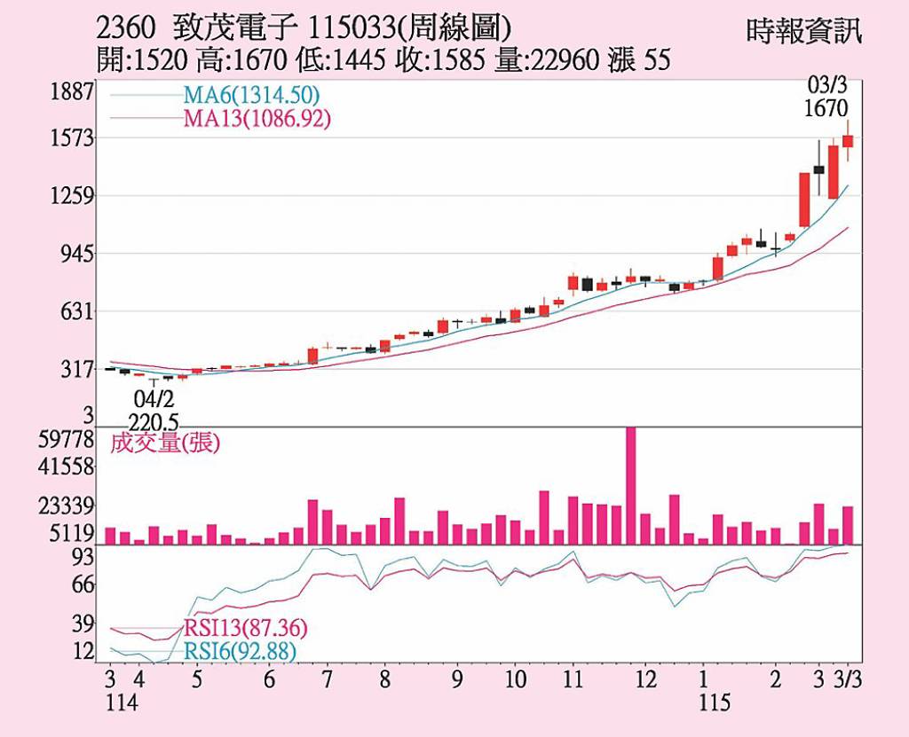 信驊(5274)受惠AI伺服器需求強勁,去年每股稅後純益(EPS)突破百元,今年成長動能延續,首季合併營收有望寫季增2成、年增4成之優異成績。營收動能主要來自AI伺服器放量、通用伺服器需求穩健,以及載板供應改善,第二季將維持強勁之營運動能。 信驊股價穩坐股王寶座,並站穩萬元水準,20日股價收11,7...