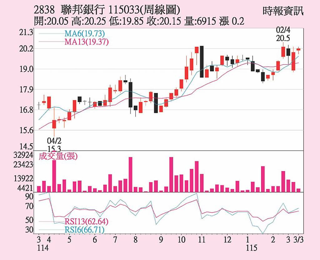 聯邦銀(2838)2月單月稅後純益7.21億元,累計前兩月稅後純益11.8億元,年增26.07%,EPS為0.27元。聯邦銀近期公告股利政策,每股擬配發現金股利0.46元、股票股利0.6元,合計總股利1.06元,股利配發率超過8成。 聯邦銀20日股價收平盤20.15元,全周上漲1%;三大法人本周全站...