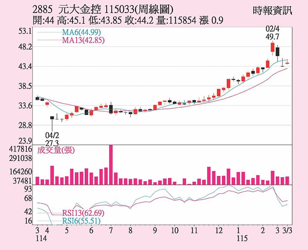 元大金(2885)2月稅後純益33.5億元,寫下歷年同月新高,年增33.4%,累計前二月稅後純益97.93億元,再寫史上同期新高,年增91.4%,每股稅後純益(EPS)0.73元。2月資本市場表現亮眼,旗下證券、銀行、投信、期貨子公司,獲利同創歷年同月新高。 上周三大法人買賣超上,外資賣超10,75...