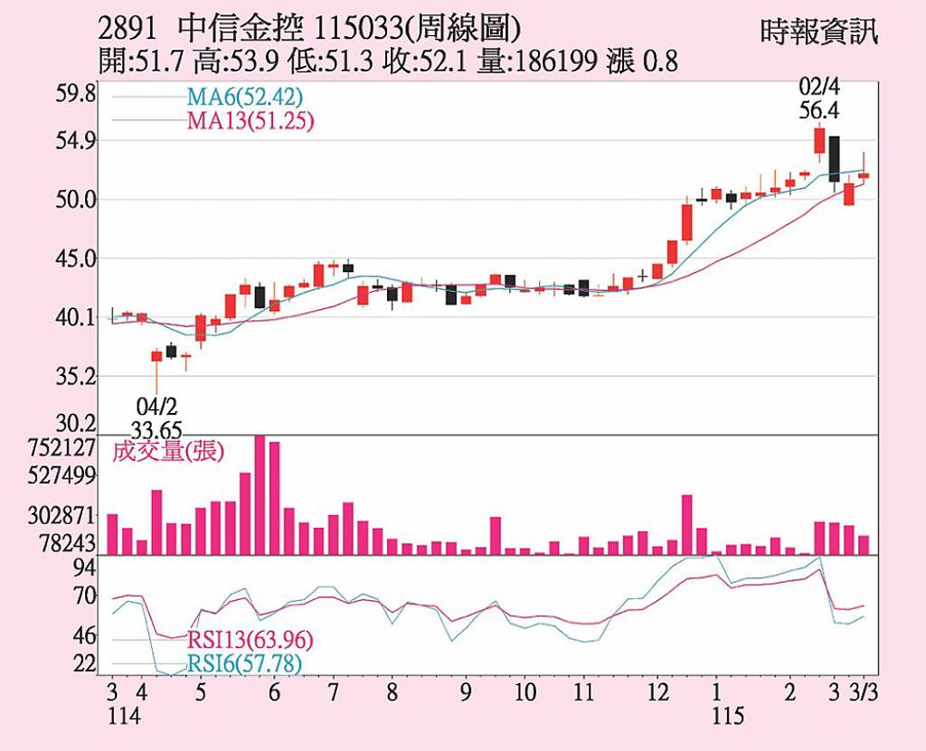 中信金(2891)2026年2月自結獲利,單月稅後純益81.59億元,累計前二月合併稅後純益155.26億元,每股稅後純益(EPS)為0.8元。子公司中信銀行核心業務動能表現良好,前二月稅後獲利99.19億元,年增20%,子公司台灣人壽2月稅後獲利31.96億元。中信金20日收在52.1元,本周上漲...