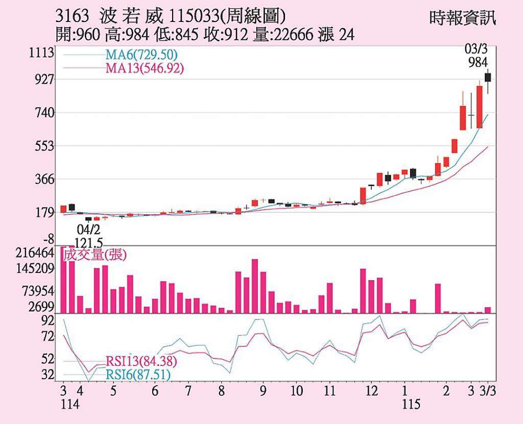 光通訊廠波若威(3163)受惠AI資料中心升級與CPO(共同封裝光學)題材發酵,成為盤面資金追逐焦點,股價表現強勢。市場看好,隨800G、1.6T以上高速光纖套件需求持續升溫,波若威在AI光通訊供應鏈中的角色可望進一步提升,帶動營運想像空間擴大。 波若威現階段AI資料中心相關布局,主要以800G及1...