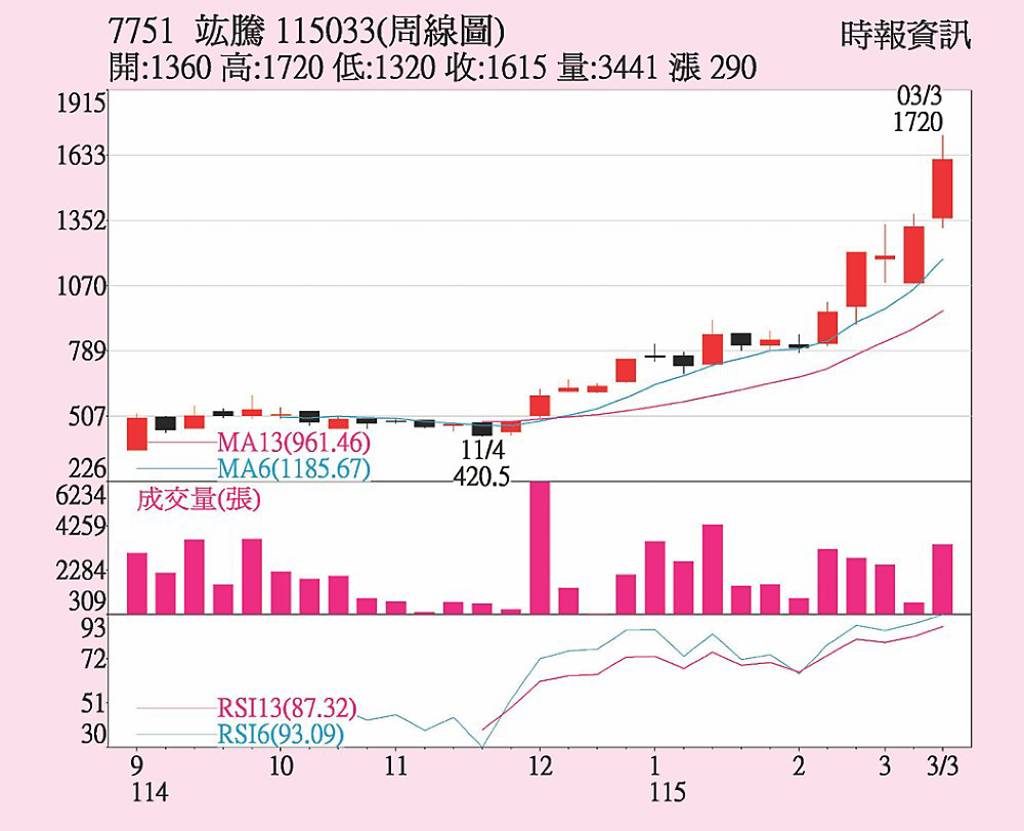 竑騰(7751)在今年營運展望正向之下,股價自3月9日的波段低點1,080元拉出一波漲勢,近日股價高點來到約1,700元高峰,惟短線急漲之後,加上國際股市震盪,也出現高檔震盪整理,目前技術指標日KD及周KD已同步呈現高檔鈍化,後市可以留意股價能否再創歷史新高。 竑騰主要客戶為前七大封測大廠及先進封裝...