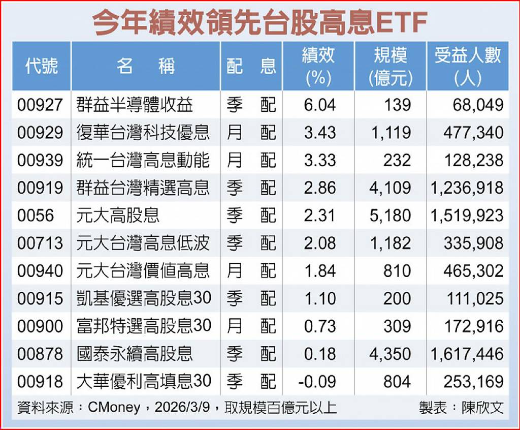 台灣存股風氣盛行,不僅中壯年族群準備退休金的方式之一,近年來不少年輕朋友透過存股來幫自己加薪,觀察台股高息ETF規模與受益人數,在整體台股ETF中,超過6成,目前台灣共計有11檔台股高息ETF規模百億以上,受益人數逾638萬人,顯見台灣投資人對於高息ETF特別偏愛。 群益投信台股ETF投資團隊表示,...