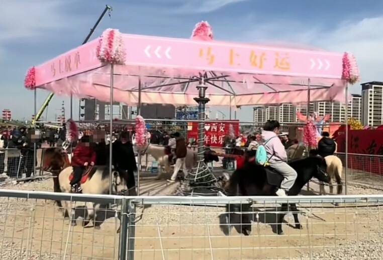中國西安詩經里近日傳出有一項遊樂設施,竟利用活馬充當「旋轉木馬」,供遊客騎乘玩樂。事件一出,迅速在社群平台上引發熱議。綜合中媒報導,中國西安詩經里景點的一項遊樂設施,推出以「真馬」取代傳統旋轉木馬的遊樂設施。只見畫面中,設施上標榜「旋轉真馬,馬上轉好運」的宣傳口號,將6匹真馬固定在鐵製的簡陋旋轉裝置上,如同傳統的「旋轉木馬設施」載遊客不斷繞圈,而頂篷上方還寫有「馬上好運」、「馬上有錢」等賀語。