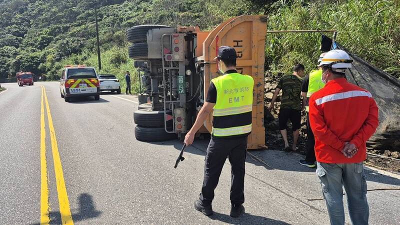 1輛砂石車今天(18日)上午行經台2線濱海公路86K、新北市瑞芳區鼻頭易肇事路段突然失控側翻,佔據往宜蘭方向車道,還好胡姓駕駛及時從駕駛座內脫困,毫髮無傷;當地交通臨時改為單線雙向通行,警方還在調查事故原因中。新北市政府警察局瑞芳分局今天上午10時11分接獲報案,台2線86K(鼻頭隧道的北端出口處)有砂石車翻覆,澳底派出所及交通分隊共4名警力趕抵發現,砂石車側翻,車斗泥塊傾瀉路旁草叢,所幸31歲胡姓駕駛意識清楚,經瑞芳消防分隊員檢查並未受傷。