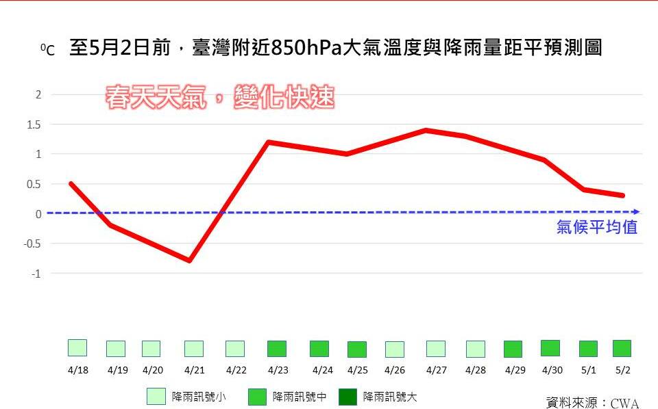 天氣風險公司分析師薛皓天指出,今(18)日受中層短波通過台灣北方影響,配合底層鋒面系統逐漸接近,白天起中部以北及東部地區將出現短暫陣雨或雷雨,午後在熱力作用加持下,降雨範圍擴大,中南部亦有局部短暫陣雨機會。