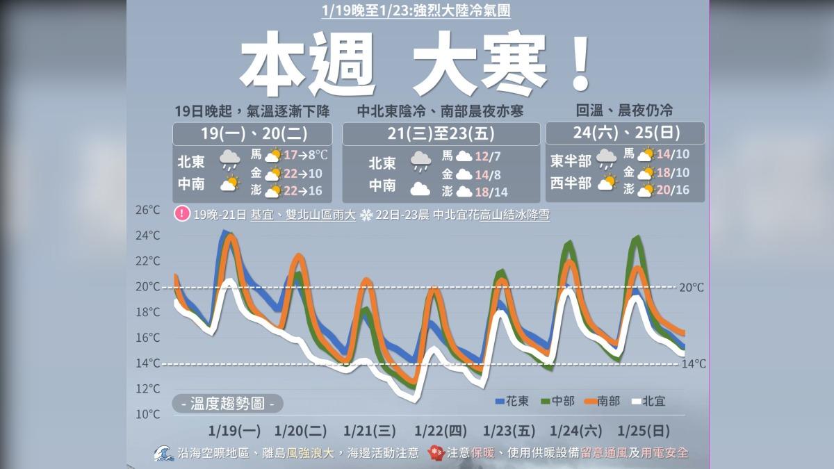 中央氣象署提醒本週即將變天!今(19)日起強烈大陸冷氣團南下,台灣北東將有水氣,週二北宜也越來越冷,且週三至週五(21~23)最為寒冷,北部也有明顯降雨,必須注意保暖與攜帶雨具。