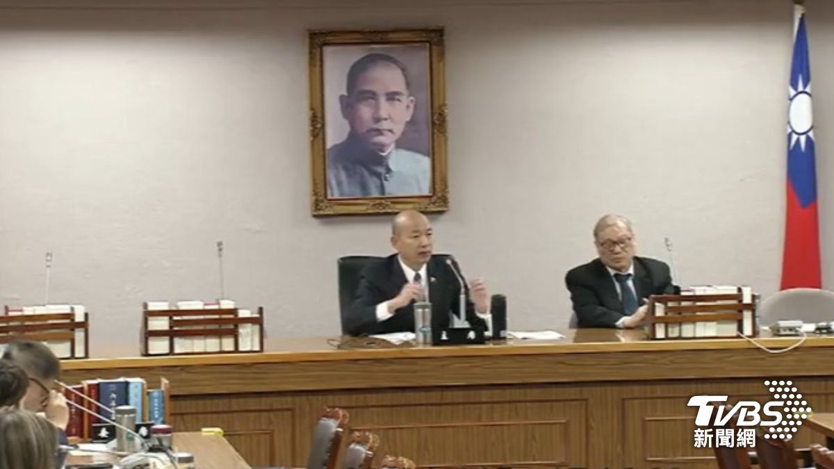立法院長韓國瑜今天在立法實務研討會上,舉滿清太監以濕紙覆蓋口鼻,使人逐步窒息而亡的故事,示警國民黨團注意危機;他說,若能讓軍購特別條例付委審查,可能等於先拿掉一張悶住口鼻的紙,若判斷錯誤,是否會讓局勢變得四面楚歌,值得深思。