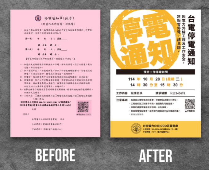 台電的「停電通知單」過去都給人制式化、紅底黑字,給人視覺相當疲勞的印象,不過台電的停電通知單近日宣布大變身,從雜亂且制式化,變成簡約又有質感的設計,網友大讚,「台灣的各方面美學設計慢慢被重視了」。設計公司在Threads發文表示,去年他們接到來自台電的委託,希望將停電通知單變得更一目瞭然,讓民眾在第一眼就抓到施工停電的重點資訊,提前為短暫停電做好準備。也讓民眾瞭解停電是為了確保施工安全,避免民眾誤會是因為缺電,或未繳電費造成停電。