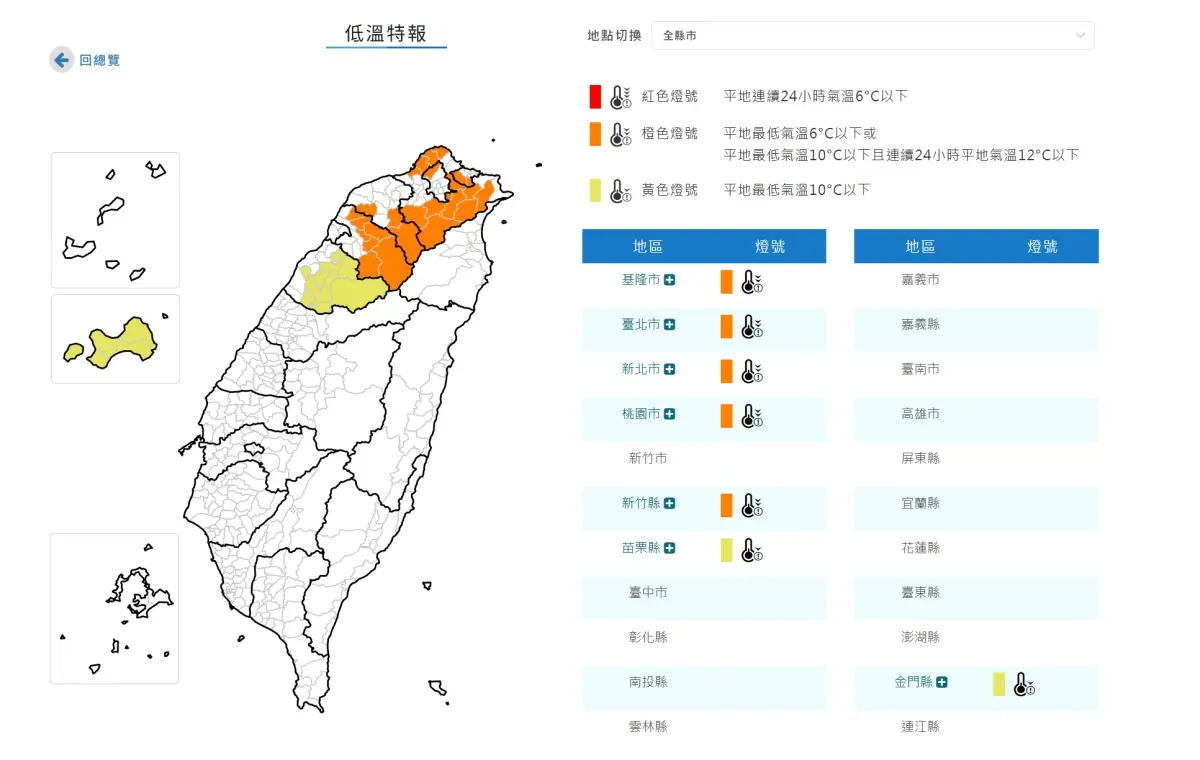 中央氣象署今(20)日22時32分發布低溫特報,受到強烈大陸冷氣團南下,明(21)日至23日強烈大陸冷氣團影響,天氣寒冷;今晚至明日新竹以北地區有持續10度左右氣溫(橙色燈號)發生的機率,苗栗地區及金門有10度以下氣溫(黃色燈號)發生的機率,請注意防範。