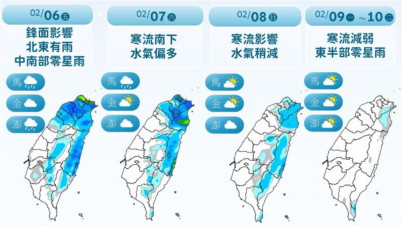 2026年首波寒流將在本周末(2月7日至2月8日)影響台灣,中央氣象署表示,低溫將持續至下周一(2月10日),型態是「先濕冷後乾冷」,降雨集中在北台灣、宜花等地,周日...