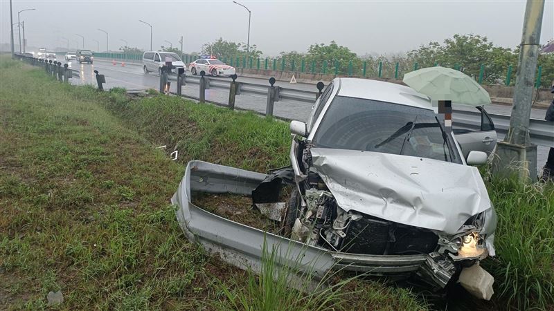 天雨路滑!國道6號草屯休息站附近路段,今(7)日下午3時許,有輛轎車行經西向6.7公里處時,因不明原因追撞前方小客車,撞擊力道猛烈,再度失控衝向外側邊坡,一度受困,所幸雙方駕駛均未受傷,至於事故發生原因有待警方進一步調查釐清。