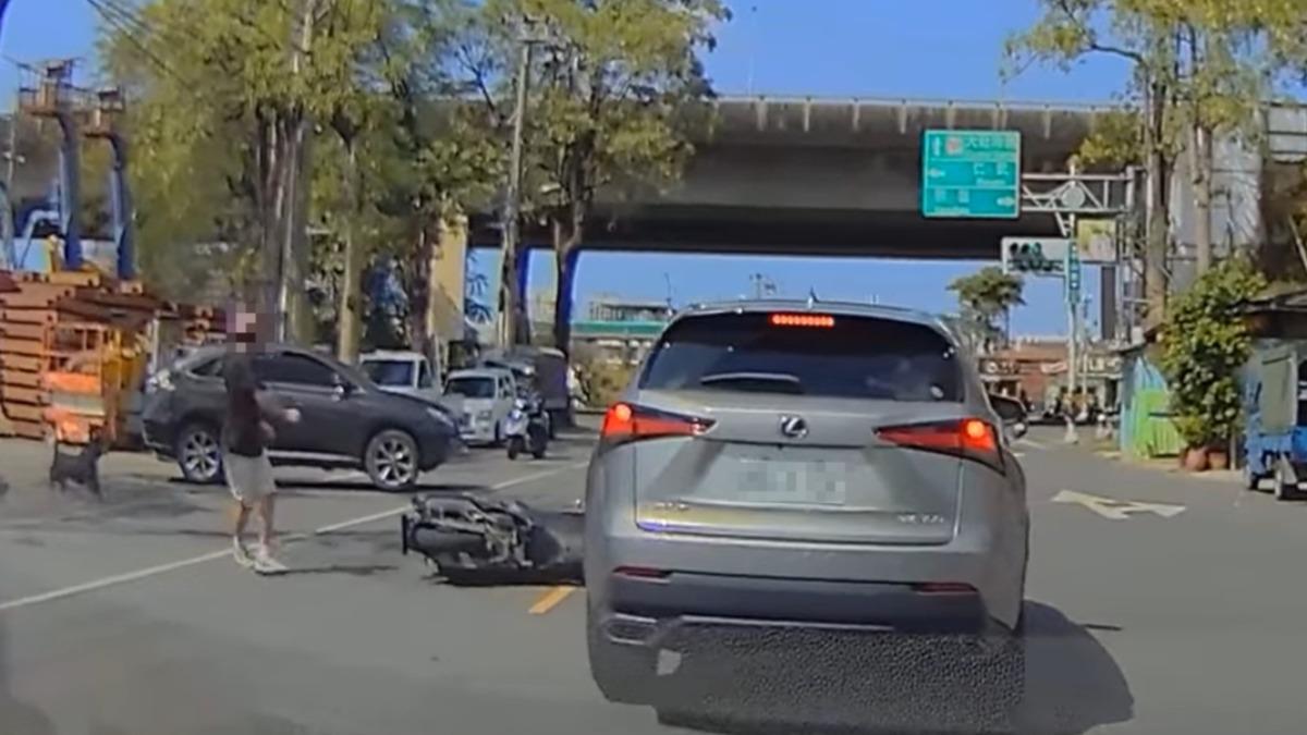 高雄大社區發生離奇車禍,22歲李姓騎士遭汽車撞擊噴飛,所幸僅受輕傷,但起身後工廠內飼養的狗狗「皮蛋」竟衝出狂吠,嚇得他連連後退!飼主急澄清皮蛋是乖狗狗,是事故後才跑出去看熱鬧。