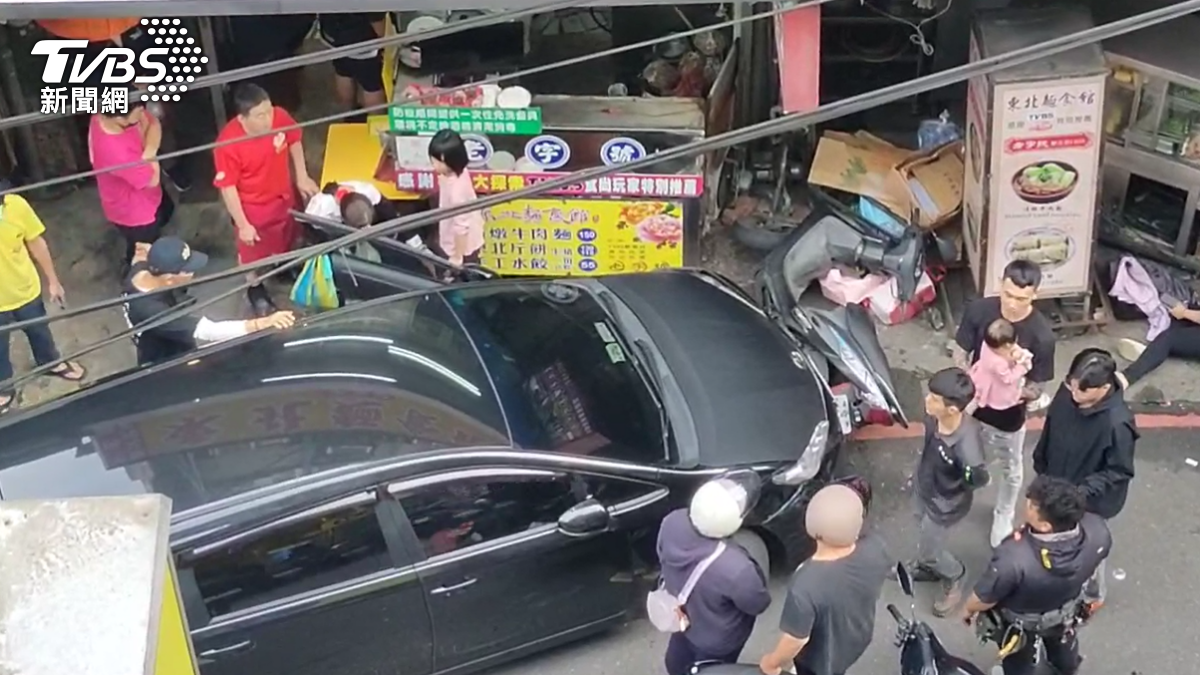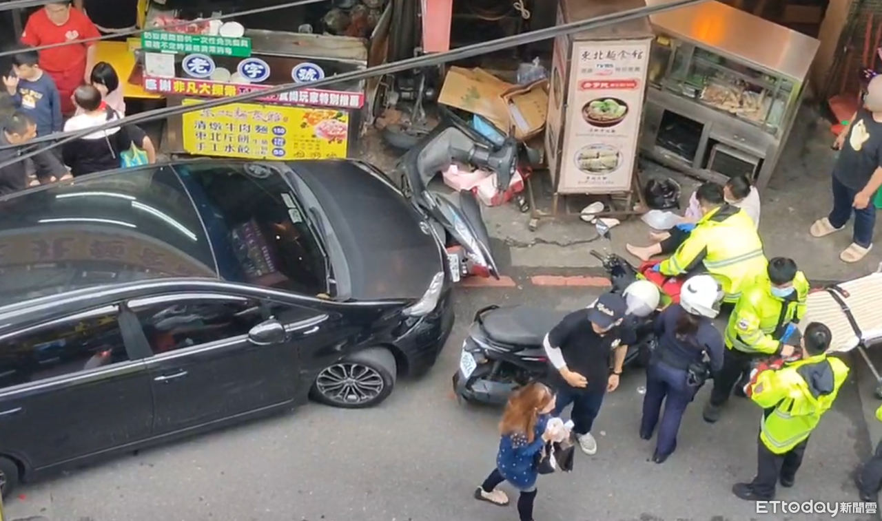 基隆廟口夜市一帶,今(5)日下午5時許發生一起車禍,一輛轎車不明原因波及2家店面,門口的設備被撞歪,且波及到一名機車女騎士與3位民眾,警消獲報到場緊急將女騎士送...