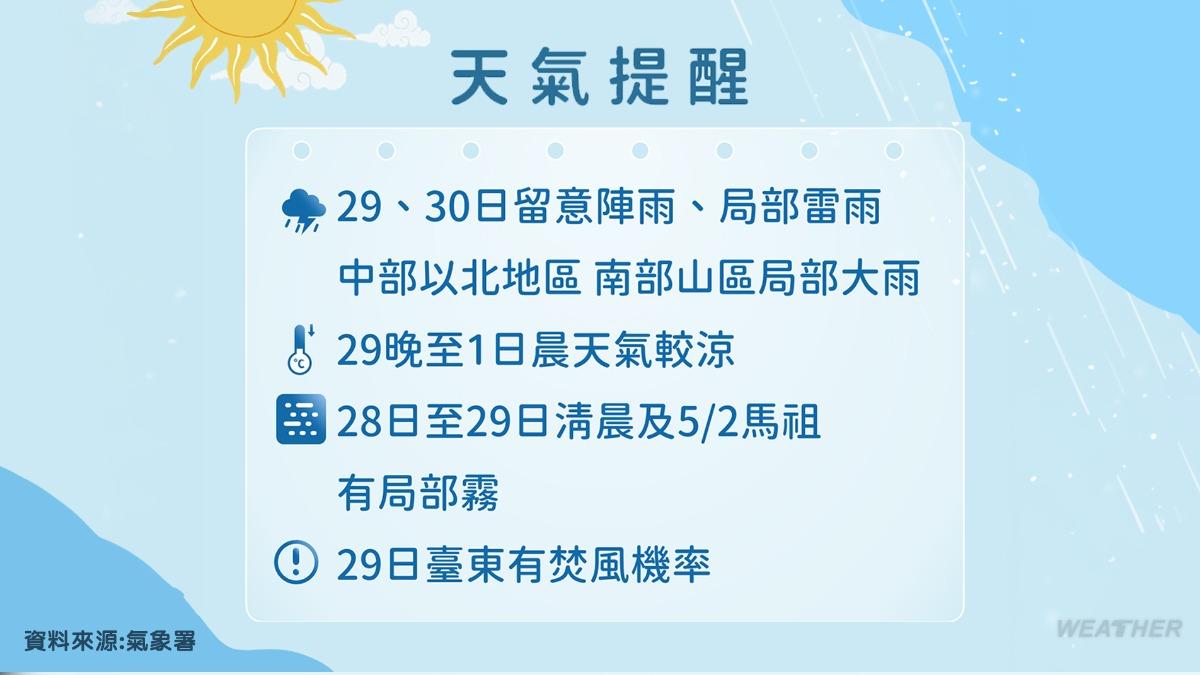 氣象專家吳德榮表示,今天天氣晴朗,白天熱如夏;29日下午鋒面逼近、30日鋒面影響,中部以北及南部山區防陣雨及雷雨;勞動節天氣回穩,但5月3日另一鋒面接近,午後有局部陣雨。