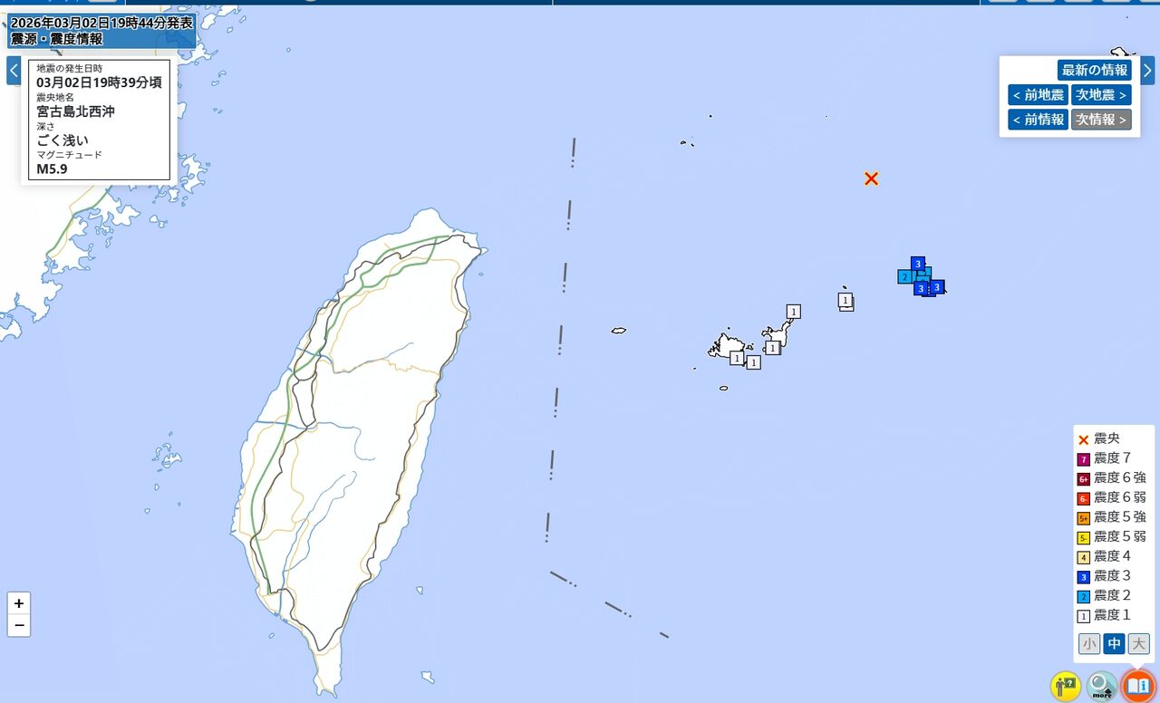 日本宮古島西北方海域2日晚間發生規模5.9地震,為近期連震中規模最大的一起。根據日媒報導,地震發生在當地時間晚間7時39分,日本氣象廳觀測指出,震央位於宮古島北西沖,震源深度極淺。