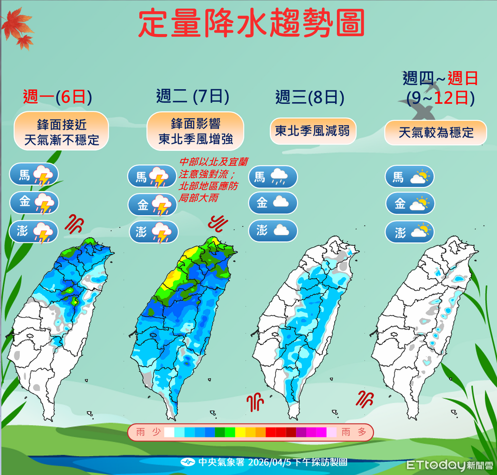 氣象署指出,今(5)晚起新一波水氣將再度移入,中部以北地區將再度轉為有雨天氣,6日又有新一波鋒面接近,隨後再加上東北季風增強等影響,全台幾乎都有下雨機會,且北部須留意局部大雨。