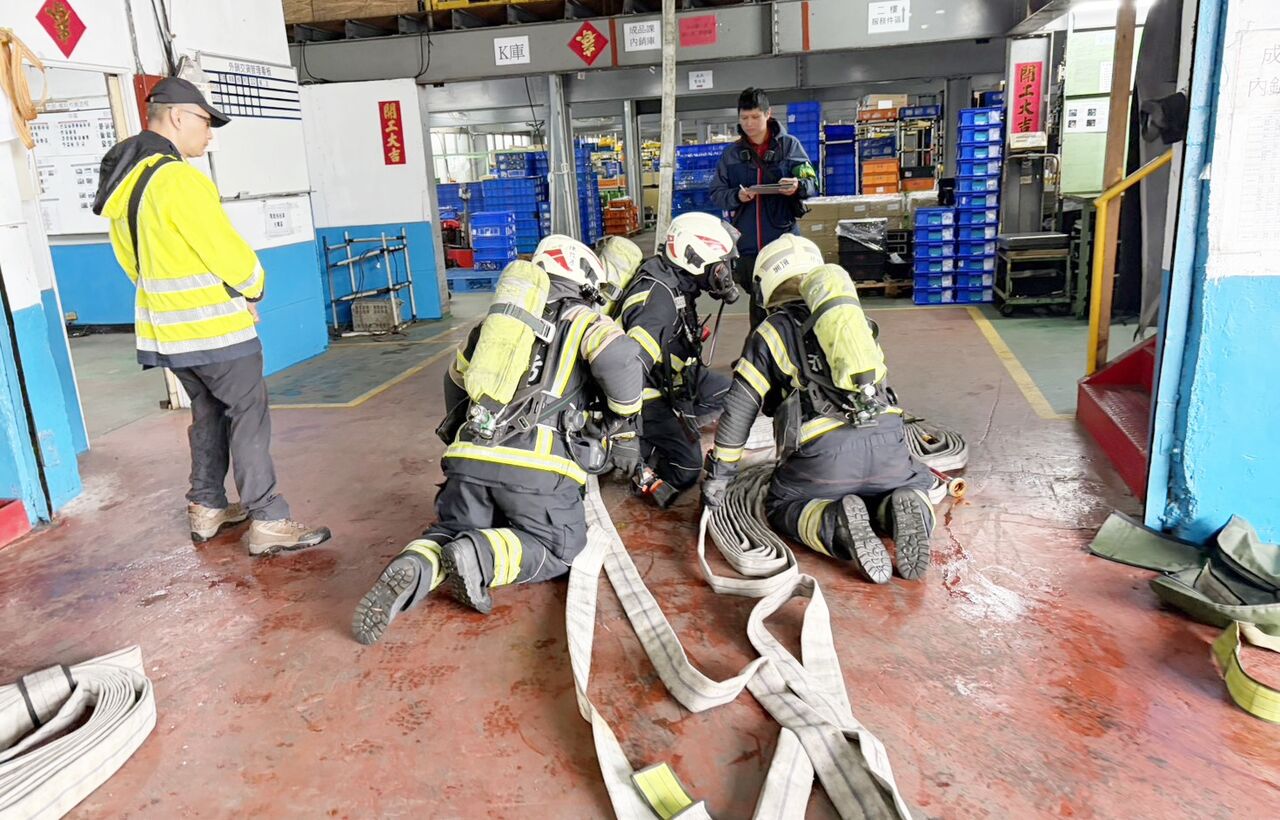 桃園市政府消防局為強化大型工廠面對火災的應變能力,第四大隊圳頂分隊今(7)日在轄區汽車零件「信昌機械倉儲」舉辦實兵推演,透過實地模擬倉儲區火警情境,檢視廠區自衛消防編組初期應變,同步強化消防人員面對複雜廠區火警環境之搶救能力。