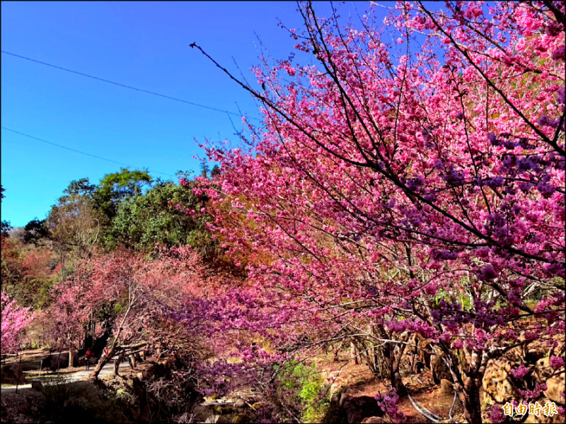 春季到來,嘉義縣櫻花盛開,粉紅色系椿寒櫻與昭和櫻接力登場,賞櫻熱區的阿里山鄉樂野村中興製茶所,粉紅櫻花與青翠茶園相映成趣;今年椿寒櫻與昭和櫻花況佳,預計最佳觀賞期可維持到本週二二八連假,因氣象預報週六、日下雨機率高,民眾需注意天氣。中興製茶所 花朵與茶園相映成趣