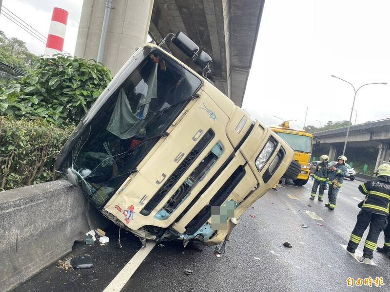 國道1號北向15.4公里內湖段,發生嚴重連環車禍!63歲許姓男子今下午駕駛小貨車行經輔助車道時,不明原因突向左偏移,撞上一旁外側車道的預拌混凝土車,兩車失控再往前衝撞4部自小客車。許男疑似因巨大撞擊力當場噴飛車外,送醫後傷重不治,本起車禍共造成1死4輕傷。