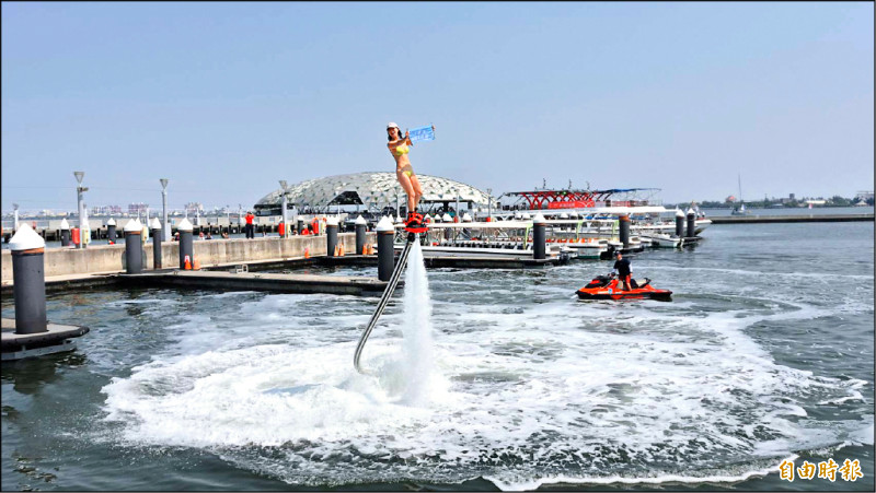 Peggy表演騰空翻轉 火辣身材展現力與美 嗨翻全場「大鵬灣帆船生活節」活動昨天在大鵬灣濱灣之心熱鬧登場,大鵬灣為全台第一個可合法營業「水上鋼鐵人」的開放水域,鵬管處特別請來女性鋼鐵人Peggy擔綱開場表演,她穿著比基尼隨著水柱在空中舞動,火辣身材,嗨翻全場。