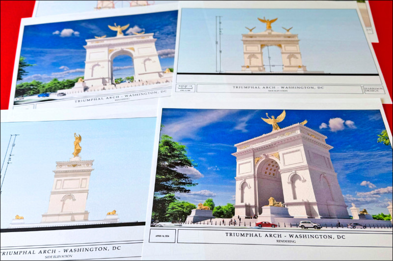 川普政府於十日公布華盛頓特區「凱旋門」設計圖,計畫在林肯紀念堂與阿靈頓國家公墓間的「紀念圓環」,建造一座高二五〇英尺(七十六.二公尺)的巨型拱門,紀念美國建國二五〇週年。該拱門主體為象牙白色,裝飾大量金色元素。中央矗立高十八公尺的帶翼自由女神像,兩側伴隨金色雄鷹雕像,基座四角有金色獅子,並刻有「上帝之下的一個國家」與「全民享有自由與正義」銘文。此拱門能否興建還需要經美術委員會審查,但因高度超過林肯紀念堂,被批破壞景觀與公墓莊嚴,民主黨更是抨擊為「面子工程」,已有退伍軍人提告阻止。(國際新聞中心)