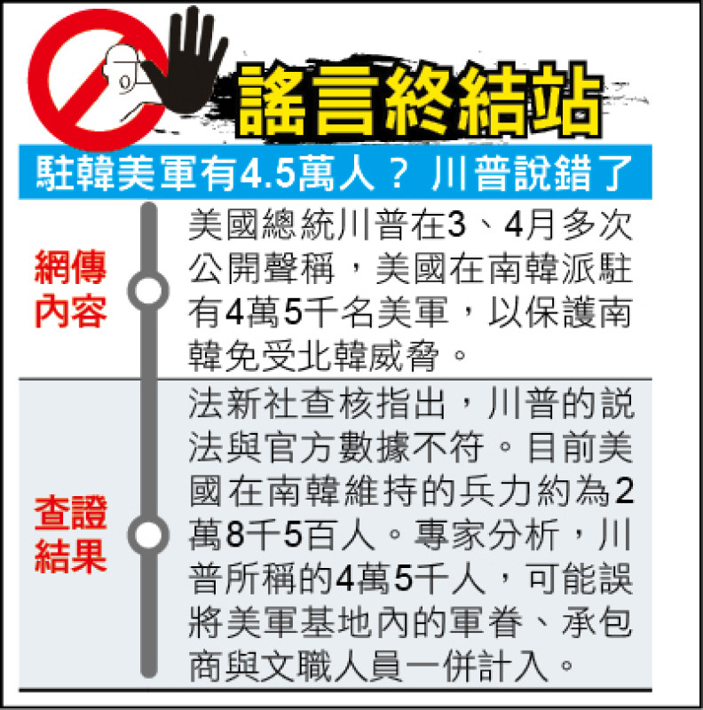 網傳消息:美國總統川普在三、四月多次公開聲稱,美國在南韓派駐有四萬五千名美軍,以保護南韓免受北韓威脅。查證結果:法新社查核指出,川普的說法與官方數據不符。目前美國在南韓維持的兵力約為兩萬八千五百人。專家分析,川普所稱的四萬五千人,可能誤將美軍基地內的軍眷、承包商與文職人員一併計入。