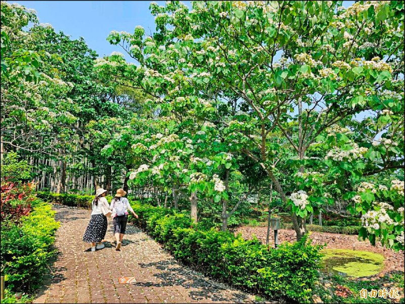 又到桐花開時節,苗栗縣桐花公園客家大院栽種上萬棵油桐樹,陸續綻放,園方昨敲鑼宣布桐花季起跑。另,縣內銅鑼鄉天空步道、苗栗市貓裏山公園、頭份市濫坑步道、三灣鄉永和山水庫周邊、造橋鄉劍潭古道、三義鄉西湖渡假村及鐵道舊山線沿線,與南庄鄉神桌山步道等處山林,也是賞桐好去處。(圖文:記者彭健禮)