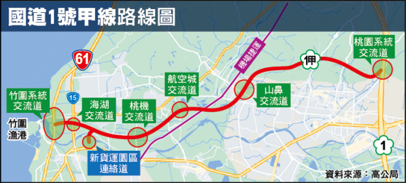 西起台61 東接國1 長11公里 設2系統、4交流道 預計2031年完工交通部高速公路局昨辦「國道一號甲線新建工程」動土祈福典禮,行政院長卓榮泰昨偕桃園市長張善政等人,循古禮祈求施工平安、如期如質完工;卓揆致詞說,國一甲線工程連接國一及台六十一線東西向快速公路,總經費八〇六億餘元,完工通車能紓解國道二號(機場支線)塞車情形,從國一林口交流道到桃園國際機場的路程、時間都縮短,讓大家進出國門更精準地掌握時間。