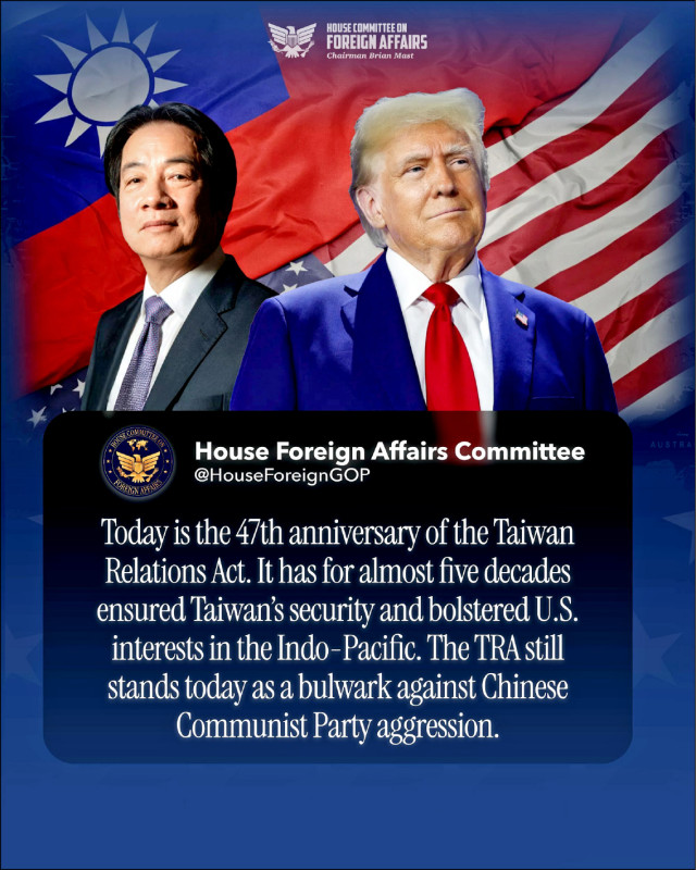 前天是「台灣關係法」立法四十七週年,多位美國國會議員於社媒貼文肯定台灣關係法是美台關係的基礎。美國聯邦眾議院外交委員會共和黨團特別在社群平台X發文,強調該法長期以來不僅確保台灣安全,更是抵禦中共侵略的堅實堡壘。特別的是,貼文的照片將美國總統川普與賴清德總統並列,背景還有兩國國旗,象徵美台穩固的盟友關係。國民黨主席鄭麗文前天與中共總書記習近平舉行「鄭習會」。肩負推動美國外交政策的眾院外委會共和黨團,用「川賴」合成照片,說明台灣對美國有重要的戰略意義,也被解讀是傳達對賴政府對外政策的支持。