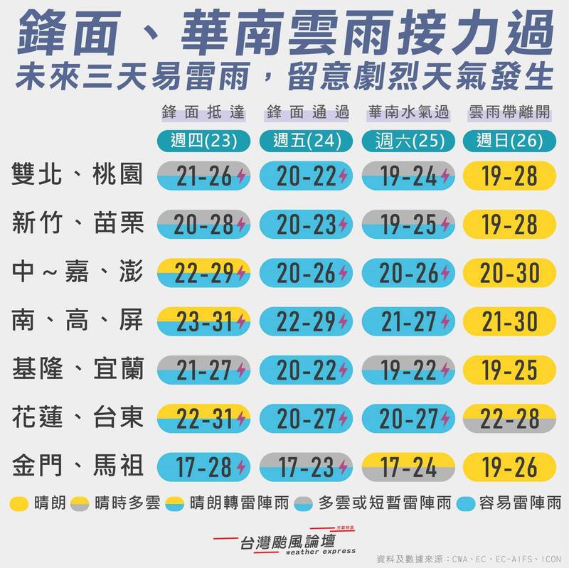 今 (23) 日鋒面通過及東北季風增強,全台各地由北往南轉為不穩定天氣。中部以北下半天起降雨趨勢明顯,恐伴隨雷擊與強陣風,並有局部大雨或短延時豪雨發生機率。受雲多降雨影響,北部及東半部高溫略降至 27 度,南部及台東則維持悶熱,局部地區最高溫上看 36 度,需留意焚風與強大溫差。預計週五及週六全台濕涼,北部低溫探 18 度,直到週日氣溫才回升,但下週三將再迎另一波鋒面。