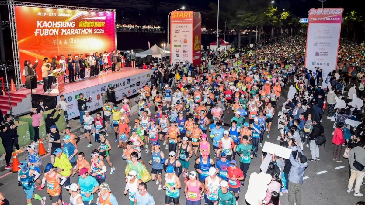 2026高雄富邦馬拉松16週年今天開跑,市長陳其邁與3名角逐市長初選參選人共同出席。陳其邁上午穿著恐龍裝參加接力趣味賽時...