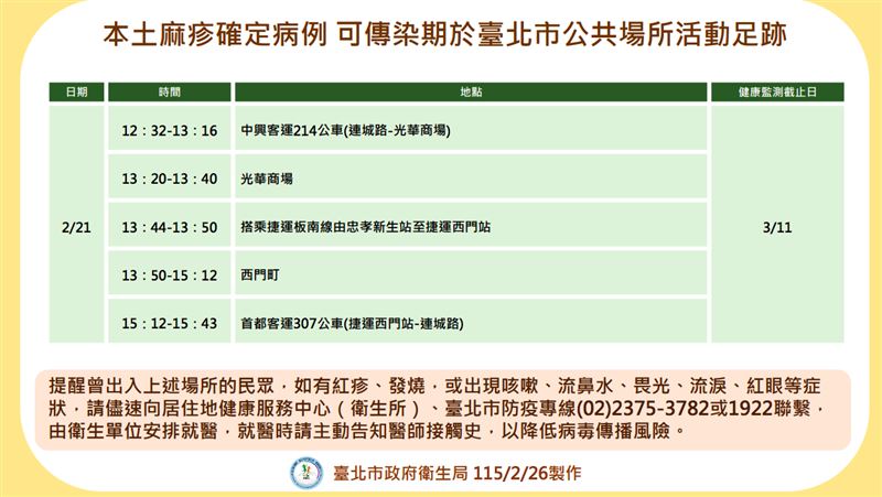 新北衛生局昨宣佈接獲麻疹確診通報,個案為中和區42歲男性,為先前境外確診個案之接觸者。對此,衛福部疾病管制署今(27)日表示,該個案為一起麻疹境外移入致國內感染群聚事件,該起群聚事件指標個案為今(2026)年2月12日公布之北部8個月大本國籍男嬰,去(2025)年與家人至越南探親,1月底返台,返國2天後陸續出現發燒、咳嗽、出疹等症狀,經就醫採檢確診,於隔離治療後已出院返家。(記者:簡浩正)