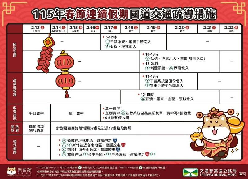 今年春節長達9天連假,南投警方提醒民眾避開春節期間易塞車路段與時段,改走替代道路,另2月19日(初三)及2月20日(初四)兩天,國道3號於南投縣境的南雲、竹山、名間、南投、中興、草屯6處交流道北上入口匝道,均從下午1時起至6時實施高承載管制,小型車必須乘坐3人以上才放行。南投警方表示,春節期間,南投除了日月潭、清境合歡山、溪頭及紫南宮4大旅遊軸線易壅塞,在國3名間交流道與國6愛蘭交流道也容易塞車,其中台3線名間交流道南下至名間鄉市區,上午10時至12時易塞車,台3線名間鄉市區北上往名間交流道,則下午3時起至晚間7時易塞車;台14線愛蘭交流道至埔里鎮愛蘭橋三岔路口(往埔里方向),上午9時至下午2時易塞車,台14線埔里鎮愛蘭橋三岔路口至愛蘭交流道(往國姓方向),下午3時起至晚間7時易塞車。
