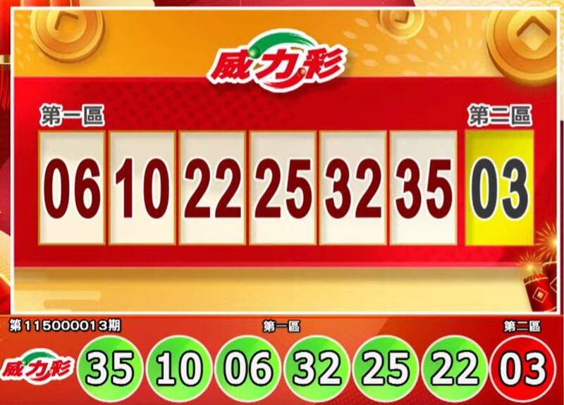 13.5億威力彩今(12)日開獎,第115000013期開獎,第一區中獎號碼由小大到為06、10、22、25、32、35,第二區中獎獎號為03。稍早,台彩派彩結果出爐,頭獎共開出兩注,獎落新北市「福泰彩券行」與新竹市「金元寶彩券行」,每注各得6.77億元。