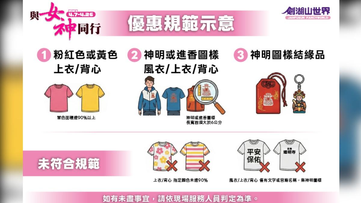 白沙屯媽祖進香期間,不僅沿途充滿隨香信眾,許多店家、企業也紛紛推出活動。劍湖山世界日前宣布限時優惠,表示去年曾與白沙屯媽祖來一場不期而遇,而今年女神與粉紅超跑再度承載著萬千人的信念來到雲林,因此祭出特別優惠,即日起至4月26日,只要拿出結緣品,或穿上黃色上衣、粉色上衣、神明圖樣上衣,就能用399元全日暢玩。