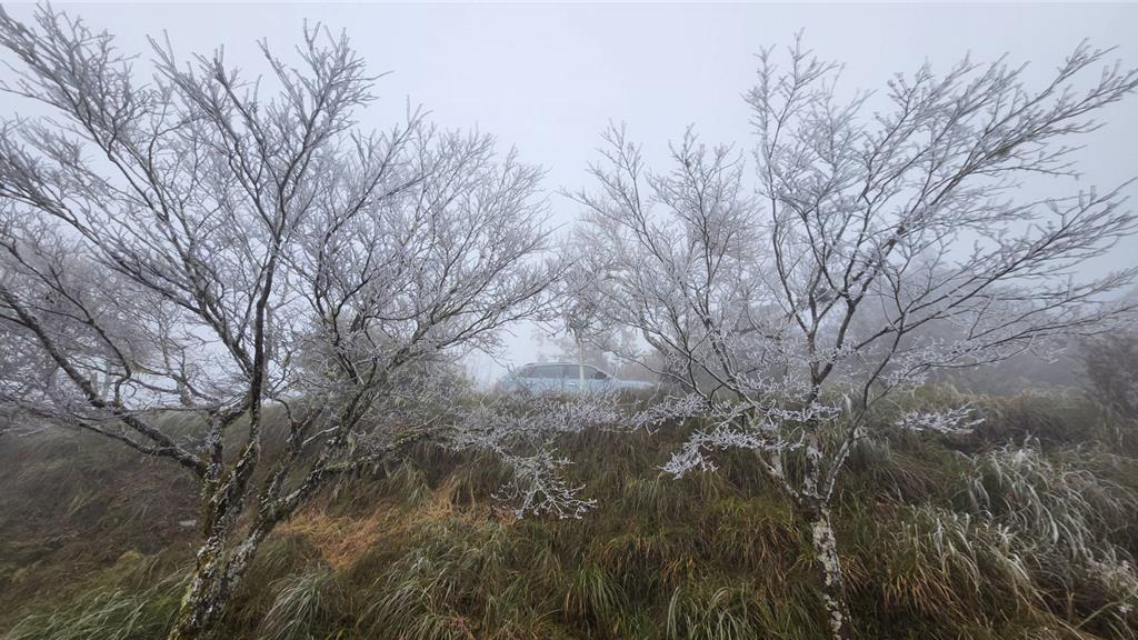 寒流襲台,宜蘭縣太平山國家森林遊樂區今天(8日)氣溫降到攝氏零度,上午11點半起,園區陸續下起冰霰,林木枝條出現霧淞景致,看起來美不勝收,許多遊客冒著刺骨寒風搶拍美景,直呼不虛此行。太平山今天清晨氣溫降到零度,因水氣不足尚未下雪,接近中午下起冰霰,隨處可見霧淞,吸引大批遊客駐足觀賞,有些人興奮地說,第一次在台灣見到這類雪白景致,此行值回票價。